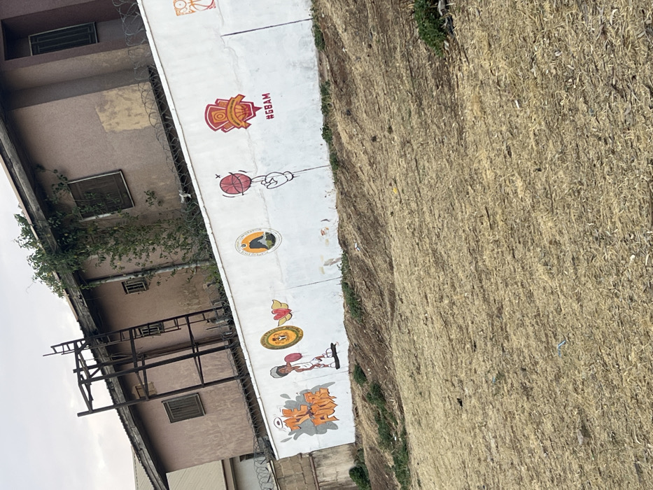 A multi-story building with a dilapidated exterior stands adjacent to a mural-covered wall, bordering a field of dried vegetation. The building exhibits visible wear, including aging facades and exposed metal structures. The mural features a sequence of colorful, illustrated icons, possibly indicative of basketball themes. The field is densely covered with brown, dried grass, extending beyond the wall. The overall scene suggests a neglected area.