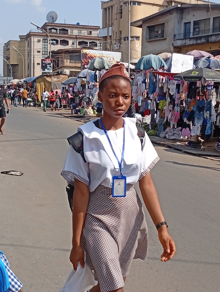 A young woman, wearing a school uniform consisting of a white top, a brown and white checkered skirt, and a brown cap, walks along a street. She is carrying a white cloth and has a blue ID card hanging around her neck. The background features a bustling market scene with various stalls selling clothes and other goods. Buildings and people are visible in the distance, suggesting a busy urban environment. The scene is captured under bright daylight.
