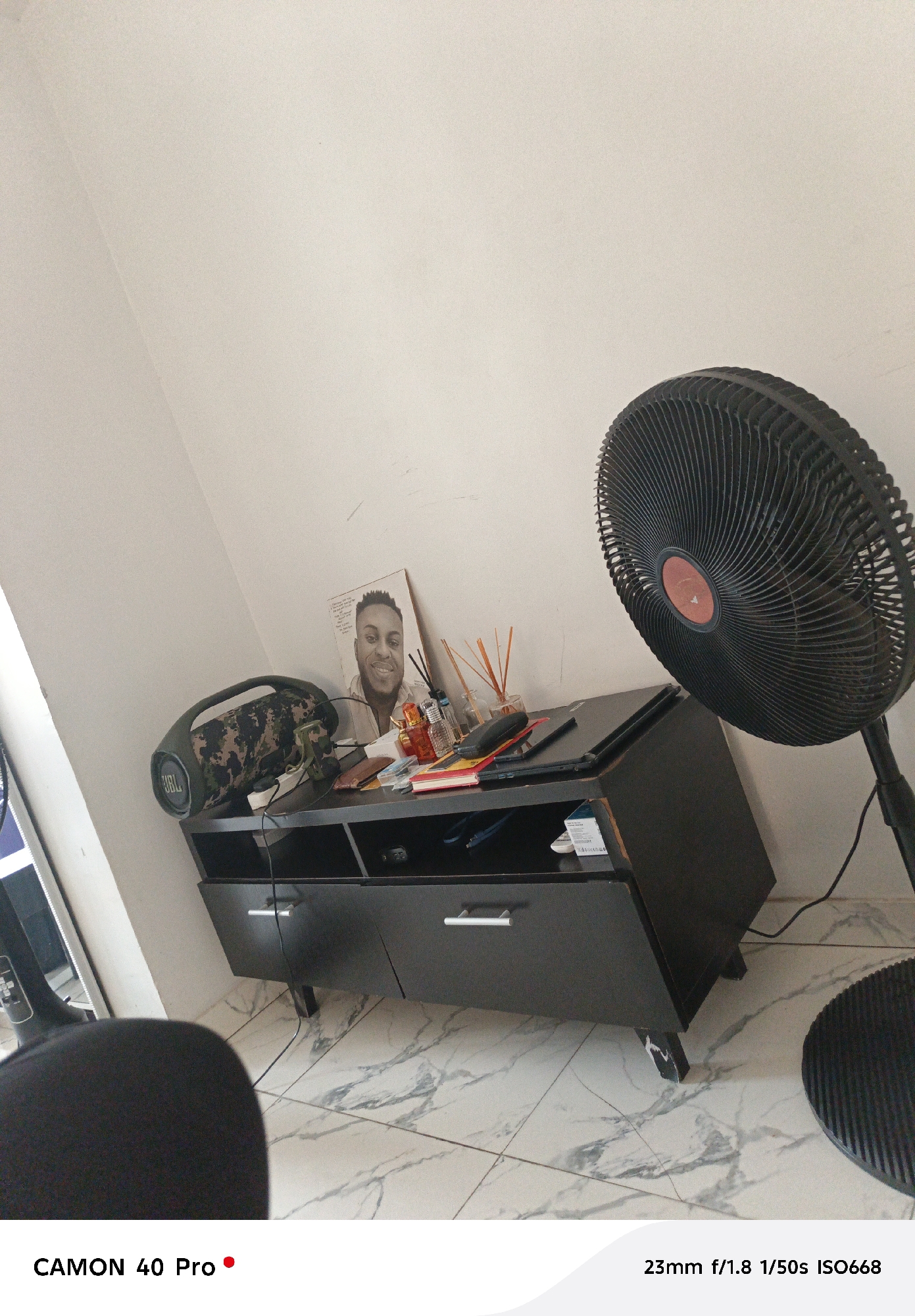 The image captures a room interior in Unknown, Unknown, featuring a black TV stand with two drawers and an open shelf, displaying a JBL boombox, a framed portrait, and various small objects like bottles and notebooks
