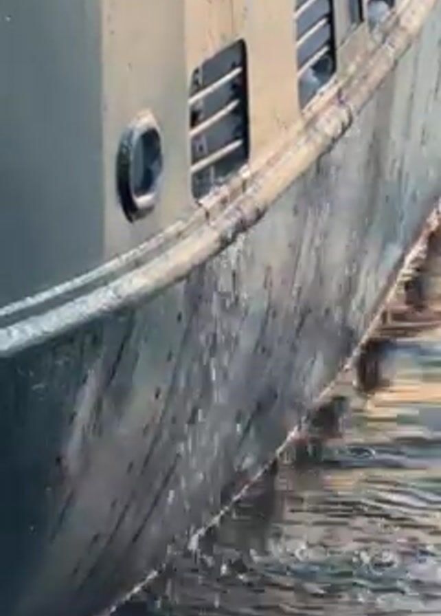 side of a dark-colored ship or boat in the water. The vessel has a slightly curved hull and a visible rub rail along the top edge. There are small windows or portholes and grated vents visible on the side. The water is close to the hull, causing a small amount of splashing. The video appears to be taken at water level, focusing on the interaction between the ship and the water. The light suggests it could be near sunrise or sunset.
