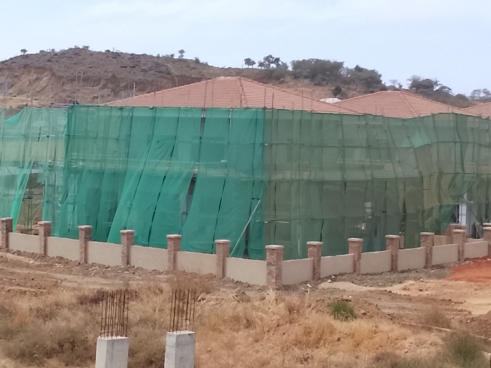 The image displays a construction site in Jos, Nigeria. Multiple multi-story buildings, characterized by terracotta-tiled roofs, are largely obscured by green scaffolding safety netting. In the mid-ground, a low perimeter wall is under construction, featuring regularly spaced reddish-brown brick pillars atop a lighter-colored plastered base. The foreground consists of uneven, reddish-brown earth with patches of dry, sparse vegetation and two concrete foundation columns with exposed rebar. The background shows a rocky, barren hillside with scattered small trees and shrubs, beneath a light, overcast sky. No individuals are visible.