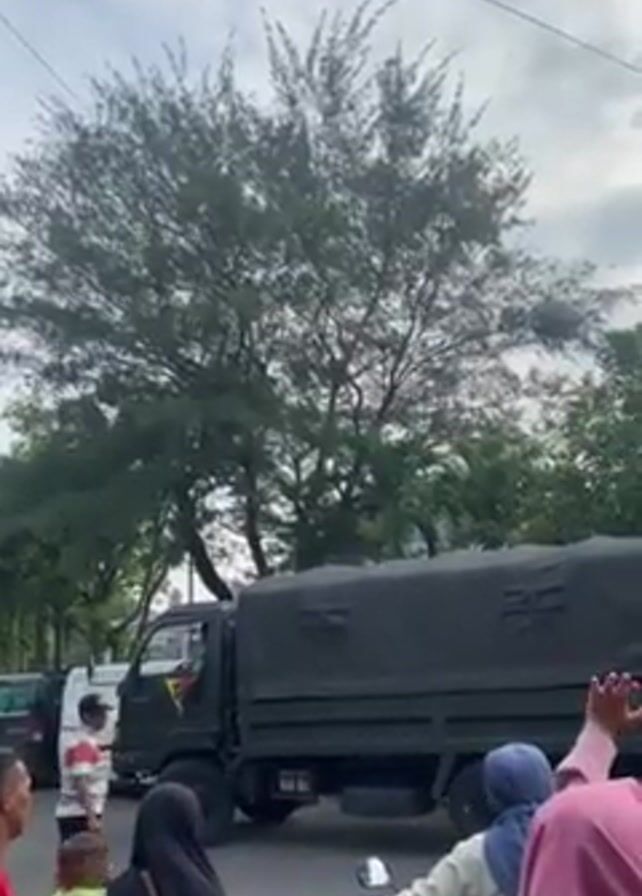 military truck moving on a street, and being waved at by a small group of people on the sidewalk. The truck is green, with a covered bed, and is traveling at a slow speed. The people on the sidewalk are mostly women wearing hijabs, and some children, who are all smiling and waving at the truck as it passes. The environment appears to be an urban or suburban area, with trees, buildings, and power lines visible in the background. The sky is overcast.