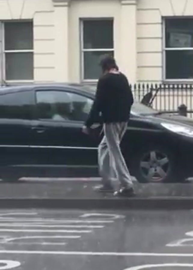 Okay, here is a description of the video: The video shows a person walking on a wet street in front of parked cars during a rain shower. The person is wearing a dark shirt, grey sweatpants, and sneakers. They walk along the curb, occasionally touching the cars as they pass. The street has white zebra crossing markings. The background features a light-colored building with windows. The rain is heavy enough to create visible splashes and puddles on the street. There are two black vehicles, a hatchback and a van, parked along the curb. Other people can be seen distantly.