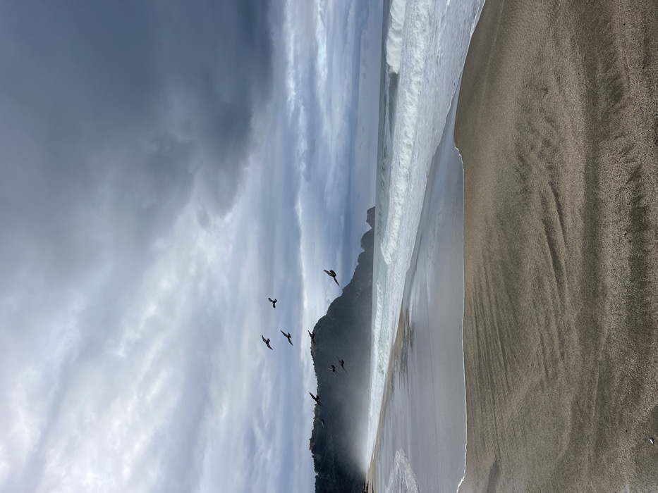 The image displays a wide, sandy beach located in Alanya, Turkey, under a heavily overcast sky. The sky is filled with dense, dark grey clouds, transitioning to a slightly lighter grey in the upper left quadrant. The Mediterranean Sea occupies the right side of the frame, characterized by numerous white-capped waves actively crashing onto the shore. The immediate foreground features a broad expanse of sand, which is wet and reflective near the water's edge, and drier with distinct ripple patterns further inland. A prominent, dark green or grey mountain range extends across the background, rising from the left and receding into the distance. Several lighter-colored structures are visible on the lower slopes of this mountain, and rocky islets protrude from the sea along the coastline to the right of the main landmass. A faint mist or sea spray is apparent at the base of the mountain where it meets the water. Approximately nine dark-colored birds are captured in various stages of flight, primarily positioned over the wet sand and the lower slopes of the mountain. A few indistinct human figures are minimally visible on the far left, near the base of the mountain.