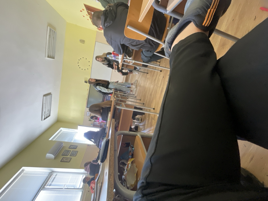 This is an interior forensic image depicting a classroom located in Cherven Bryag, Bulgaria. The perspective is from a low angle, showing the lower legs and feet of an individual wearing black trousers and black athletic shoes with orange stripes on the right foot, indicating a seated viewpoint. Approximately eleven individuals, appearing to be young adults or teenagers, are visible within the classroom. Most are seated at individual desks made of wood and metal, with their backs or sides to the camera. On the mid-right, a male student is seated in a black hooded jacket. In the center-right, two female students are standing. One female wears a light-colored vest over a dark top and light-wash jeans, carrying a backpack. She faces the second standing female, who has long blonde hair, wears a dark top, and is positioned near a desk holding a red bottled beverage. Other students are seated in various positions throughout the room. The classroom features a large white board on the front wall. Above the white board, a partial clock face with numbered markings is affixed, along with small red decorative cutouts on the right side. The left wall contains two large windows equipped with white horizontal blinds, allowing natural light to enter. An air conditioning unit is mounted above these windows. Several framed items hang on the wall between the windows and the whiteboard. The ceiling is white, fitted with two rectangular fluorescent light fixtures. The walls are painted a light yellow, and the floor is a light-toned wooden or laminate material. Desks in the foreground show minimal items, including notebooks and a dark pencil case.