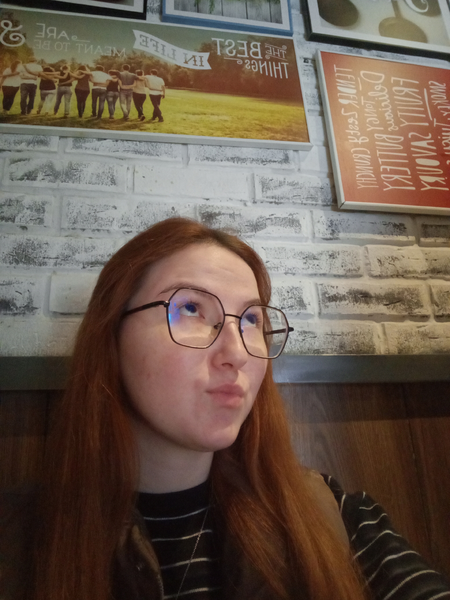 A young adult female with long, reddish-brown hair and octagonal-framed glasses is depicted in a close-up, slightly low-angle shot, looking upwards and to her right with a slightly puckered expression. Reflections of blue light are visible on her glasses lenses. She wears a dark and white striped top with a thin silver-colored necklace and a dark vest or jacket. The background features a white faux brick wall with gray mortar lines and distressed areas. Above a dark horizontal band, possibly a shelf, the wall is paneled with vertical wood. Multiple framed pictures or canvases are displayed on the wall: one depicts a group of ten people walking in a grassy field with mirrored text "THE BEST THINGS IN LIFE ARE MEANT TO BE SHARED"; another is an orange-red canvas with mirrored white text, including words like "FRUITY", "CRUNCHY", "DELICIOUS", and "TENDER". The scene is located indoors, possibly within a cafe or restaurant, in Chaikovsky, Russia.