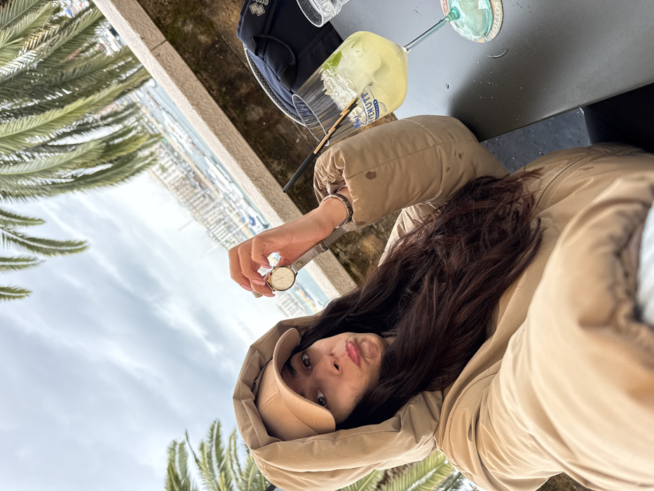 A female individual is depicted in a close-up selfie, wearing a tan hooded puffer jacket with the hood up and a beige baseball cap underneath. Her dark hair flows over her shoulders, and her facial expression shows pursed lips in a pout. Her left hand is raised, holding a small, round wristwatch with a metallic mesh band, displaying its face. On the dark table to her right, a large stemmed glass filled with a light green beverage, garnished with lime wedges and mint leaves, is present with a black straw. The glass bears the inscription "VERRUTI" and rests on a light-colored coaster partially revealing "SOTTOZERO". A dark blue bag with an "ERREA" logo is partially visible behind the glass. The background consists of a light-colored stone railing, beyond which lies the Porto Vecchio (Old Port) of Bari, Italy, filled with numerous boats under an overcast sky. Large palm trees frame the upper left and right portions of the scene, indicating a waterfront location consistent with establishments along Lungomare Imperatore Augusto, such as Verruti Sottozero, overlooking the old port.