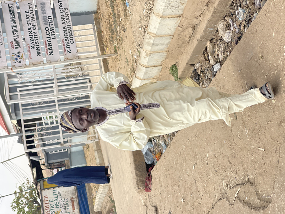 An outdoor scene in Unguwar Gabas, Zaria, Kaduna State, Nigeria, depicts an adult male walking on an unpaved pathway. The subject, appearing to be 50-70 years old with dark skin and a short beard, wears a light-cream traditional tunic and trousers featuring dark embroidery, complemented by a striped cap and dark open-toed sandals. He holds a dark-colored smartphone in his left hand, with his right hand near his torso. His mouth is slightly open, and he looks towards the right of the frame. In the mid-ground, a second individual in a dark blue full-body covering and light-colored shoes stands further down the path to the left. The background displays a grey metal gate and a building with a red roof edge. To the right, a multi-paneled sign lists project details: "CLIENT: KADUNA STATE GOVERNMENT," "BENEFICIARY: KADUNA STATE MINISTRY OF HEALTH," "CONTRACTOR: NABALCO AND SONS LIMITED," and "CONSULTANTS: K-DESIGNS AND COST CONSULTANTS." To the left, a weathered sign partially reads "REDITED STATE HEALTH B. ABDULLAHI HOSPITAL, ZARIA." The foreground and mid-ground consist of a cracked dirt and concrete path. A concrete-lined ditch runs parallel to the path on the right, filled with refuse including plastic bags and wrappers. Additional litter is present near a concrete curb on the left. The sky is overcast.