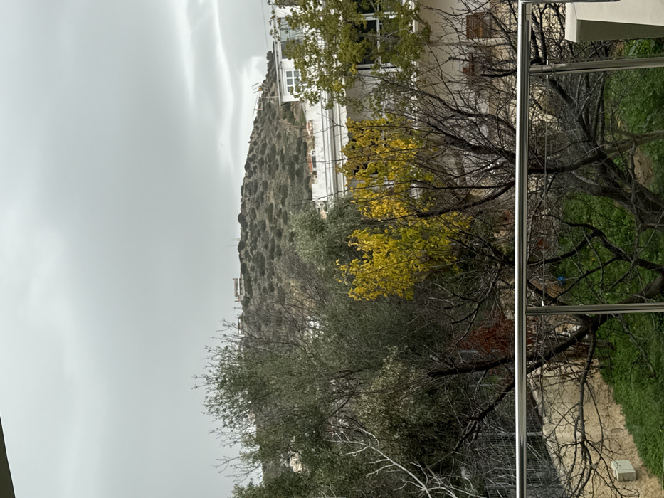 An exterior photograph captured in the Kalyvia Thorikou Municipal Unit, Greece, displays a landscape under an overcast sky. The foreground is occupied by a metallic balcony railing, featuring horizontal bars and vertical supports in a silver finish. Immediately below the railing, a garden plot is visible, characterized by green ground cover and multiple trees. These include several deciduous trees, largely bare or with minimal foliage, and one prominent tree exhibiting vibrant yellow leaves in the center-left. Evergreen trees with olive-green leaves are interspersed within the mid-ground vegetation. Behind the immediate tree line, sections of residential buildings with white facades and visible windows are present. One building displays a flat roof adorned with an antenna array. The background is dominated by a large hill or small mountain, covered in sparse, scrubby, brownish-green vegetation. Scattered light-colored houses and structures are discernible on the hill's slopes and near its summit. The sky is uniformly grey and heavily overcast, indicating significant cloud cover. No individuals or discernible actions are observed.