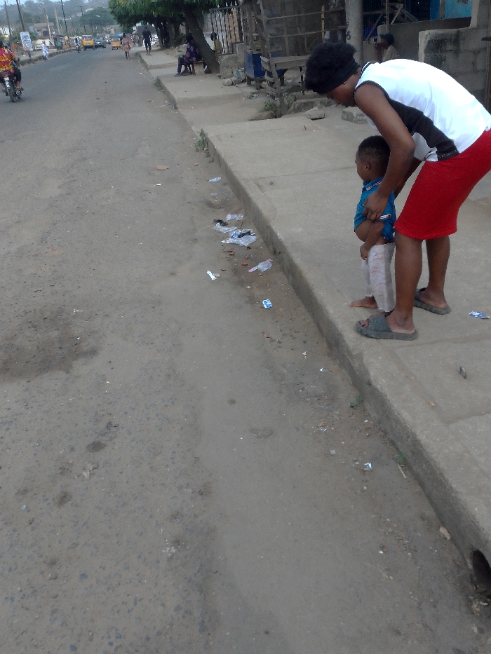 A woman wearing a white shirt, red skirt, and sandals stands with a young child in a blue shirt and light-colored pants on a sidewalk. The sidewalk is littered with scattered debris. The road is to the left, and a drain runs alongside the sidewalk. In the distance, other people and vehicles can be seen on the street. Some people are sitting on benches under trees. The scene is an urban outdoor setting.