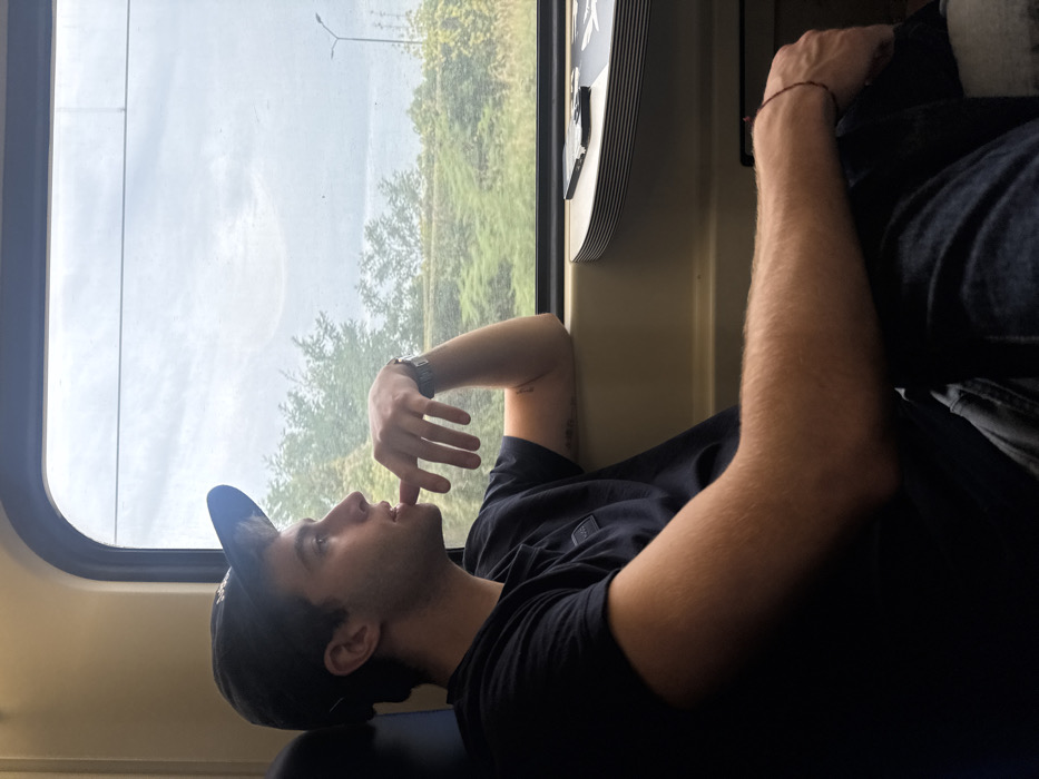 - "A young adult male is seated in profile, facing right, within a train carriage" by FM-6wyrF3, licensed under CC BY 4.0