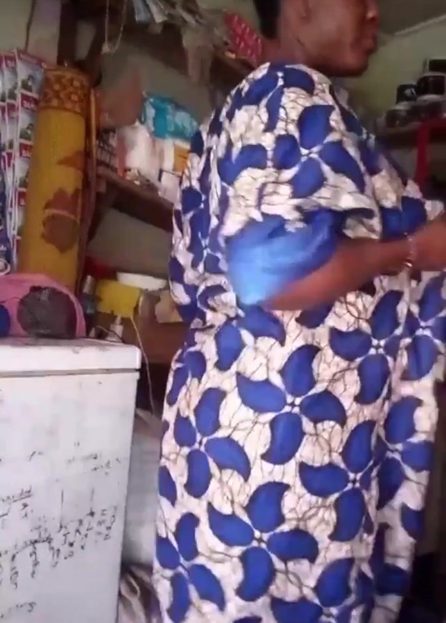 A woman stands inside what appears to be a small shop, dressed in a blue and white patterned dress. She turns to look directly at the camera. Behind her are shelves stocked with various items, and to her left is a white refrigerator with writing on the front. Music plays in the background.