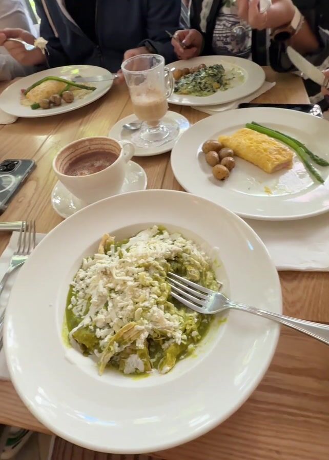 group of people dining at a restaurant. A wooden table is laden with plates of food and drinks, including chilaquiles in both red and green sauce, a latte, and a cup of hot chocolate. Some people are eating with forks, while one man eats a sandwich. A phone rests on the table near the chilaquiles. The restaurant appears to have a glass ceiling with a metal framework.