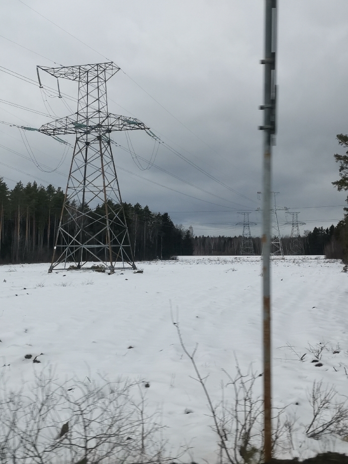 The image depicts a winter landscape in Гожскі сельскі Савет, Belarus, under an overcast sky. In the foreground, blurred bare tree branches and sparse vegetation protrude from snow-covered ground. A prominent, vertically oriented, rusted metal pole or signpost, partially out of focus, occupies the right side of the frame. The mid-ground features a vast, flat expanse of snow, with a large, galvanized steel lattice-type electrical transmission tower standing prominently on the left. This tower supports multiple electrical lines, visible stretching horizontally across the scene via insulators. Further in the background, to the right of the main tower, two additional, smaller transmission towers are visible in the distance across the snow-covered field. A dense line of dark green coniferous trees forms a forest boundary running horizontally across the mid-background, separating the field from the distant horizon. The sky is uniformly light gray and overcast, indicating a cloudy day. No people or animals are visible, and no discernible actions or interactions are occurring.