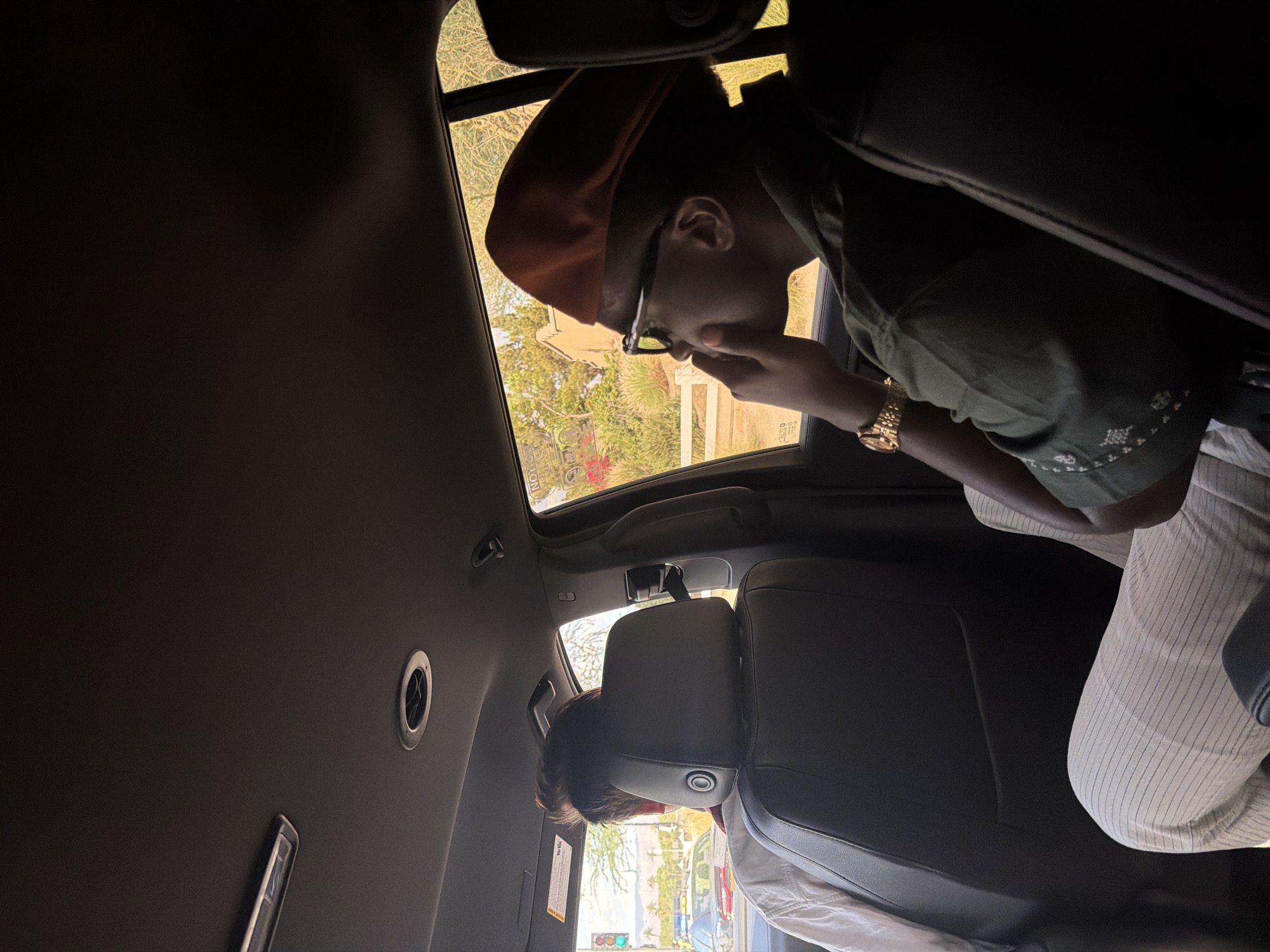 An image taken from the interior of a vehicle shows two individuals; one appears to be a passenger in the backseat, and the other, partially visible, is presumed to be the driver