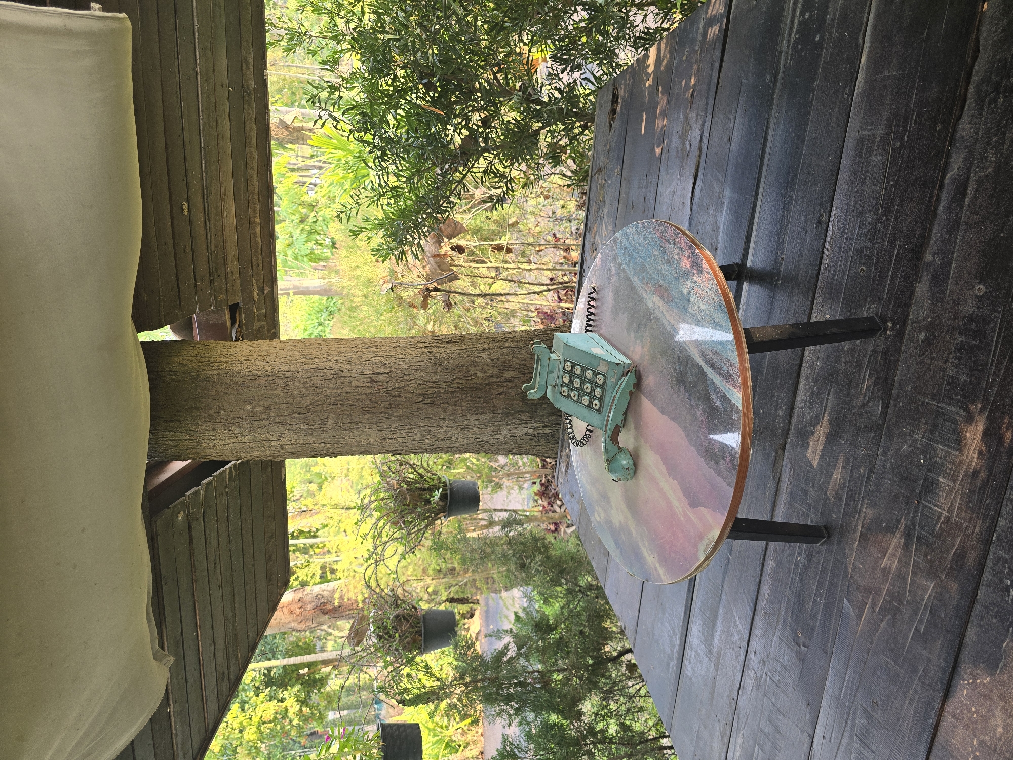The image depicts an elevated outdoor wooden platform or deck located in Ban Phaya Kot Ana Kaeo, Thailand. The platform floor consists of dark, weathered wooden planks laid horizontally. A small, round table with a multi-colored top, featuring swirling patterns of greens, blues, pinks, and browns, stands on dark, slender legs in the foreground. Resting on the table is an antique-style, teal-colored push-button telephone; its handset is detached from the cradle and positioned beside the main unit, connected by a black coiled cord. Above the platform, a white fabric canopy is partially visible, hanging over an underlying structure of dark wooden planks. A large, textured tree trunk rises vertically through the scene on the right, integrated into the structure. The background consists of dense, lush tropical vegetation, including various green shrubs, trees, and conifers. Several potted plants are suspended from an unseen support on the left. A narrow, paved path is faintly visible through the foliage in the mid-distance on the left side. No individuals are present in the scene.