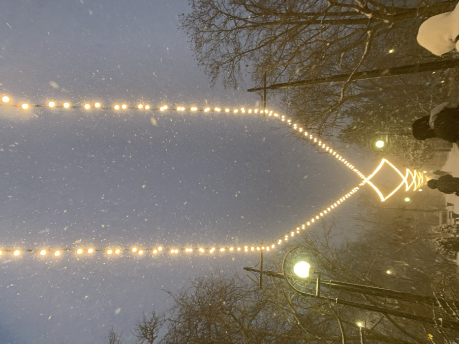 The image depicts a snow-covered pedestrian pathway in Central Park of Culture and Leisure named after Maxim Gorky (Gorky Park) in Rostov-on-Don, Russia, during twilight or night. Heavy snowfall is visible throughout the frame, illuminated by numerous light sources. Overhead, two parallel strings of warm-toned incandescent or LED lights form a large 'U' shape, converging towards the center of the frame. These strings then intersect to create a large, prominent diamond-shaped light structure, before continuing further down the path as parallel lines, forming an illuminated tunnel effect. Several classic-style streetlights with glowing white globular lamps are positioned along the path; one is prominently visible on the left side with an ornate, curved metal frame. The ground is uniformly covered in a thick layer of fresh white snow, defining the width of the pathway. Deciduous trees with bare, snow-dusted branches line both sides of the path. Snow-covered benches are partially visible along the left side of the pathway. Multiple individuals are present on the path, walking away from the camera. In the foreground on the right, a person is seen from behind, wearing a dark hooded jacket. Slightly further ahead in the mid-ground, another person in dark clothing is also walking away. Several additional indistinct figures are visible further down the illuminated path in the distance. No specific interactions between individuals are discernible. The overall environment suggests a festive winter evening in a public park setting.