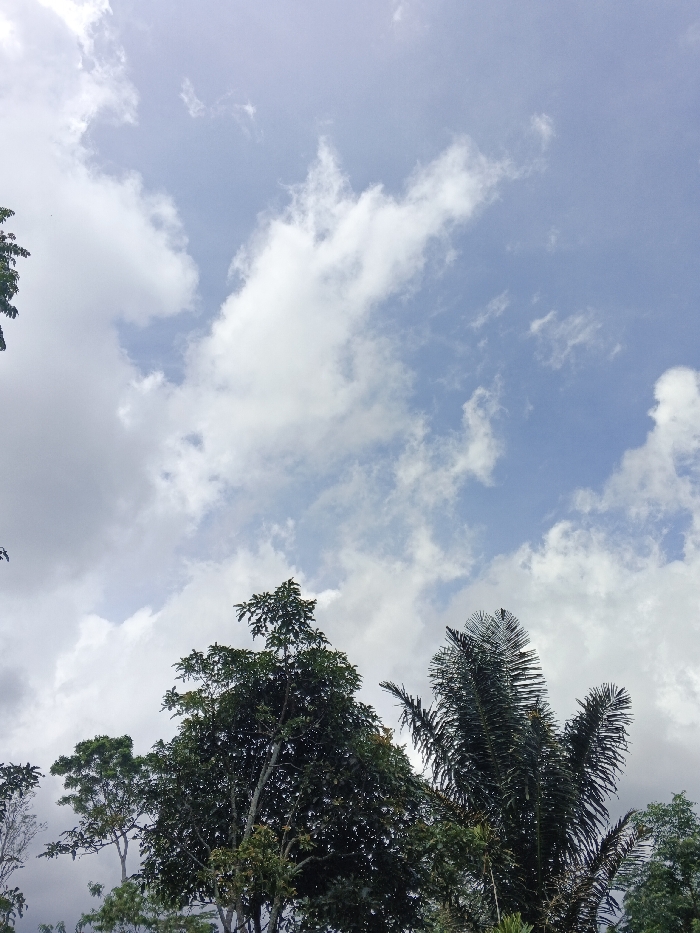 The image displays an outdoor scene in Palayan, Philippines, viewed from a low-angle perspective. The upper two-thirds of the frame shows a light blue sky with scattered white cumulus and stratocumulus clouds of varying densities. The lower third of the image is occupied by the upper canopies of multiple trees. A dense, broadleaf tree with dark green foliage is centrally positioned, extending upwards from the bottom edge. To its right, a palm tree with long, dark green fronds is prominent. Portions of other trees with lighter green foliage are visible along the left and far right edges of the frame. No individuals, animals, or man-made structures are present within the scene. The environment is illuminated by natural daylight.