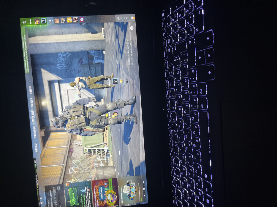A dark-colored laptop with a purple-white backlit Cyrillic keyboard is depicted in a dimly lit indoor environment, identified as being in Etropole, Bulgaria. The laptop screen displays a video game, consistent with Counter-Strike 2 or Global Offensive. The game interface is visible, showing menu options in Bulgarian, including "ИНВЕНТАР" (Inventory), "СНАРЪЖЕНИЕ" (Equipment), "ПУСКАНЕ" (Play), "МАГАЗИН" (Store), and "НОВИНИ" (News) at the top. Performance metrics, including CPU and GPU usage, are displayed in the top left corner. A prominent "Активирайте Windows" (Activate Windows) watermark is present in the lower right portion of the screen. The central game scene features two character models in an urban, industrial-style environment with concrete walls, graffiti, and debris. In the foreground, a character wearing a full gas mask, a tactical vest, dark uniform, knee pads, and boots stands facing slightly right. In the mid-ground to the right, a second character is visible, dressed in a balaclava, a light-colored top, and green trousers, holding a weapon. The background includes a metal trash bin and what appears to be a wooden pallet. The scene is illuminated by artificial light sources within the game environment.