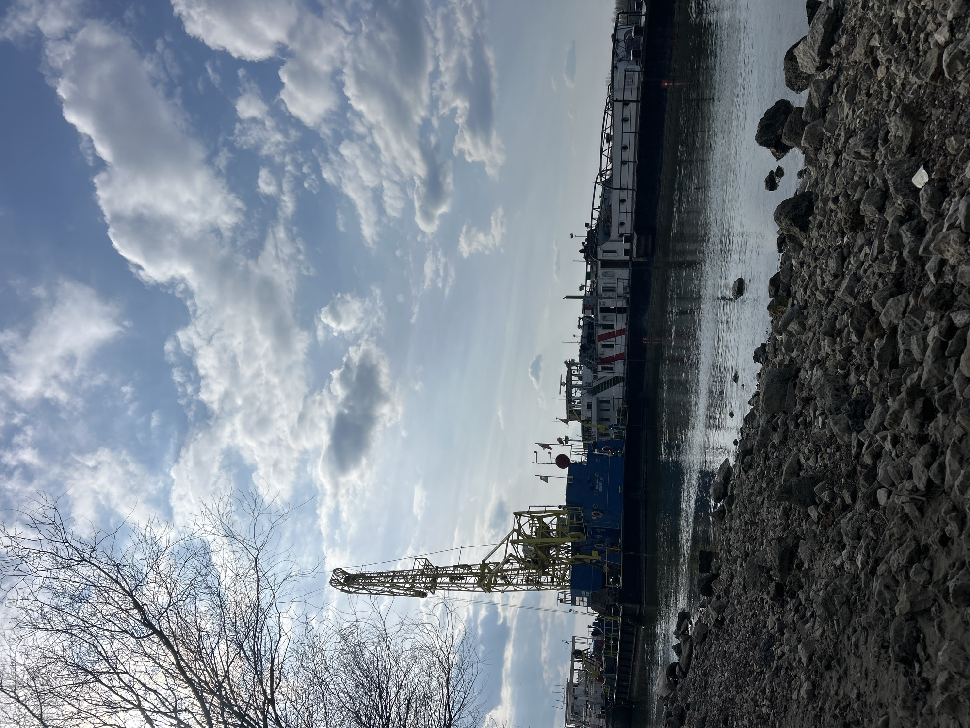 The image displays a riverine scene in Giurgiu, Romania, under a partly cloudy blue sky with scattered white cumulus clouds. In the immediate foreground, a rocky and somewhat muddy riverbank, composed of various grey stones, slopes down towards a calm body of water. To the upper left, dark, bare tree branches are silhouetted against the sky. Dominating the midground on the water are several vessels. The central and most prominent vessel is a blue barge-like structure with a tall, yellow latticework derrick or crane structure rising from its deck. Visible text on its blue hull includes "DEMAG" and "BAUGESELLSCHAFT," and a white plaque clearly shows "GIURGIU RO." This vessel is adorned with several small flags on its superstructure. To the immediate left of this central vessel, a portion of a white-hulled vessel with dark railings is visible. To its right, a longer, white and grey vessel with distinctive red vertical stripes on its hull is moored. This vessel also features railings and a cabin superstructure. No individuals are visible within the frame. No specific actions or interactions are depicted, presenting a static scene. The distant riverbank is faintly discernible as a low, dark line on the horizon in the background.