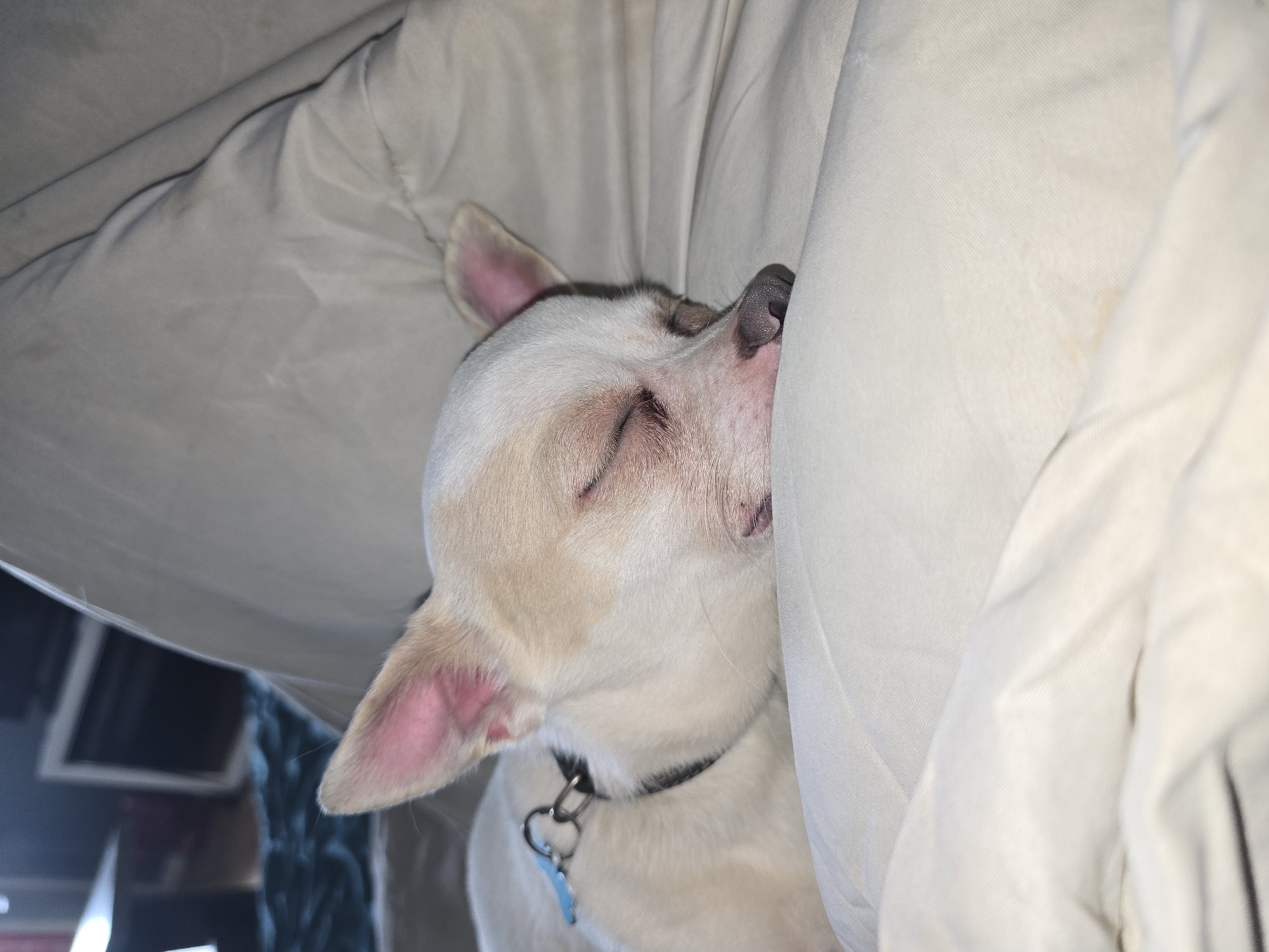 - "A small, short-haired dog, identified as a chihuahua or similar breed, is depicted sleeping on a cream-colored fabric surface" by FM-dTRWD3, licensed under CC BY 4.0