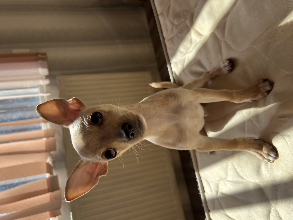 - "An indoor scene in Gurkovo, Bulgaria, features a small, tan-colored dog, likely a Chihuahua or similar toy breed, seated on a light-colored, quilted upholstered surface, possibly a mattress or cushion" by FM-vJR2C2, licensed under CC BY 4.0