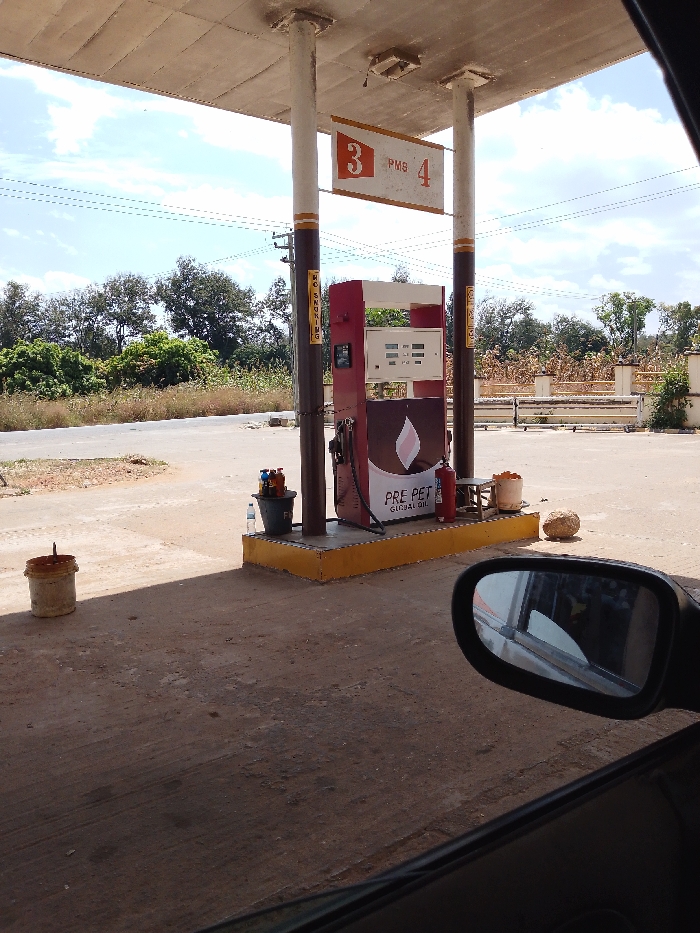 The image presents a daytime view of a fuel station located in Kuru Dungus, Nigeria, observed from within a vehicle