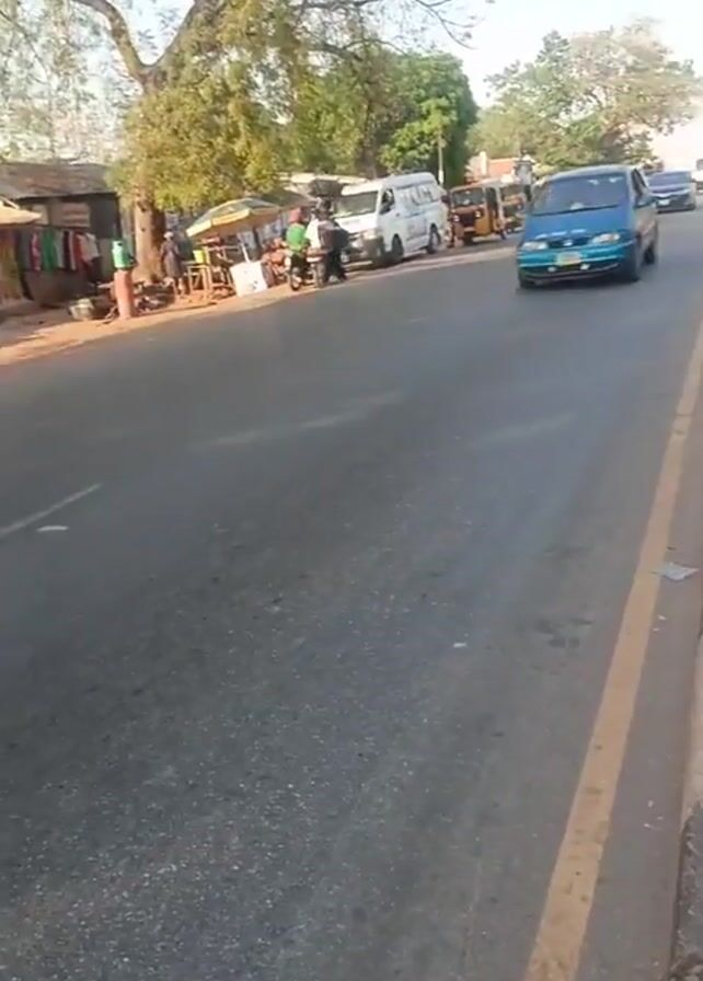 street scene during daylight. The camera is stationary and filming from the side of the road. Several vehicles drive by on the asphalt road, including a gold sedan, a turquoise minivan, and a black sedan. Other vehicles like white vans and auto rickshaws are parked on the side of the road. Several people are visible around roadside stalls and shops. A large tree with bare branches is on the side of the road, providing shade. The sky is light blue.