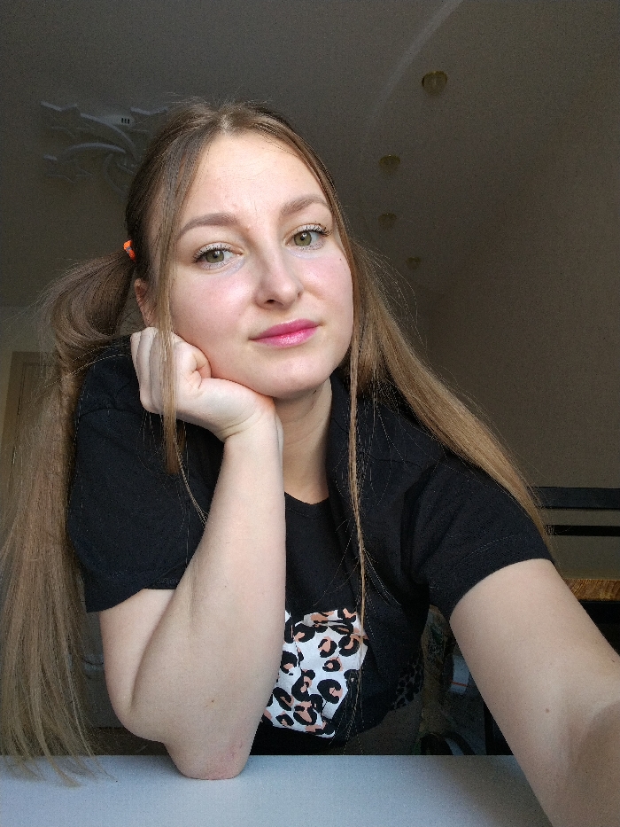 A young woman with light brown hair in pigtails rests her head on her hand. She's wearing a black t-shirt with a leopard print design. She has fair skin, green eyes, and pink lipstick. The background is blurry and shows a room with a decorative ceiling fixture and several downlights. A table or counter is visible at the bottom of the frame.