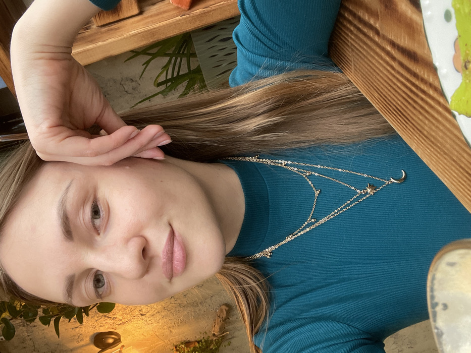 A female subject is depicted in a close-up, head-and-torso portrait, captured indoors, likely within a restaurant or cafe in Batumi, Georgia. The subject is a light-skinned individual with long, straight, light brown hair. She has light-colored eyes, light eyebrows, and light pink lips, presenting a slight smile while looking directly at the camera. She wears a teal-colored, high-necked, ribbed long-sleeved top. Adorning her neck is a layered gold-colored necklace; the top chain features small spherical beads, the middle chain has a star-shaped pendant, and the lowest chain displays a crescent moon pendant. Her left hand is raised, with fingers curled, resting against her left temple and cheek. The background consists of a textured, light-colored wall with green foliage from multiple plants. A warm-toned, yellow light source is visible in the upper left quadrant. A wooden table with prominent grain occupies the foreground on the right side, on which a partial white plate containing green food is visible. Additional wooden structural elements are present in the background.