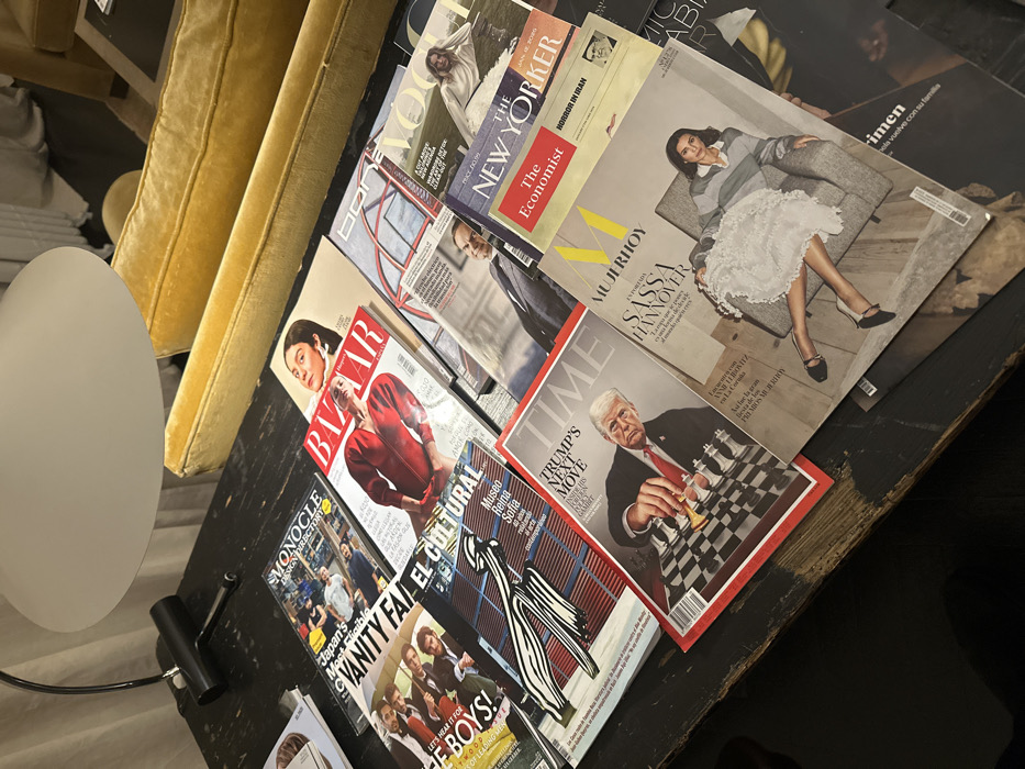 Several magazines are stacked on a table. Titles include Vogue, The New Yorker, The Economist, Time with an image of Donald Trump playing chess, Mujerhoy with Sassa Hannover, Bazaar, Vanity Fair, El Cultural, and Monocle. A lamp stands to the side and a yellow pillow or cushion is visible in the background. The magazines feature diverse cover images, from fashion models to political figures.