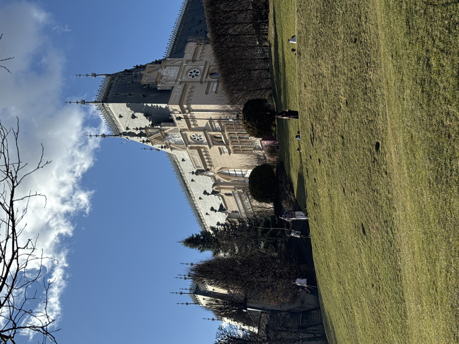 The Palace of Culture in Iași, Romania, is depicted under a bright blue sky with scattered white cumulus clouds. The large Neo-Gothic structure, characterized by its light-colored facade and an intricate dark grey roof adorned with multiple spires and architectural details, occupies the upper half of the image. A verdant green grassy slope fills the foreground and midground, ascending towards the building. Deciduous trees with bare branches and dark evergreen shrubs are positioned along the base of the palace and on the incline. Approximately ten individuals are present on the grass. On the left side of the slope, several people, one in a white top, are standing near the building's foundation. Towards the center-right, a person in dark attire stands upright on the slope. Further to the right, multiple individuals are seated or reclining on the grass, with one figure visible in a white garment. The scene is brightly illuminated by direct sunlight.