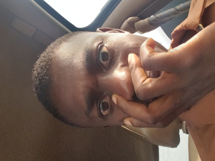 A man's face is captured in an extreme close-up, his expression conveying shock or surprise. His eyes are wide, pupils dilated. His hand is positioned over his mouth, fingers slightly splayed. His skin tone is dark, and his hair is short and close-cropped. He appears to be sitting in a car, with the ceiling and sunroof visible in the background. The overall lighting is somewhat bright, creating strong highlights on his face.