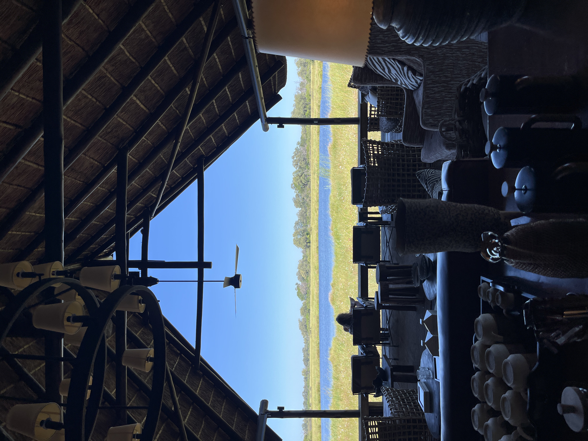 n interior scene looking out onto a landscape, likely from a building in Khwai, Botswana. The building has a thatched roof supported by a dark metal framework and a large, circular chandelier. Through an opening, the view reveals a body of water lined with tall grass and trees, under a clear blue sky. Seating is arranged on the interior, with wicker chairs and tables. A person is seated at one of the tables. A sideboard with teacups is visible in the interior.