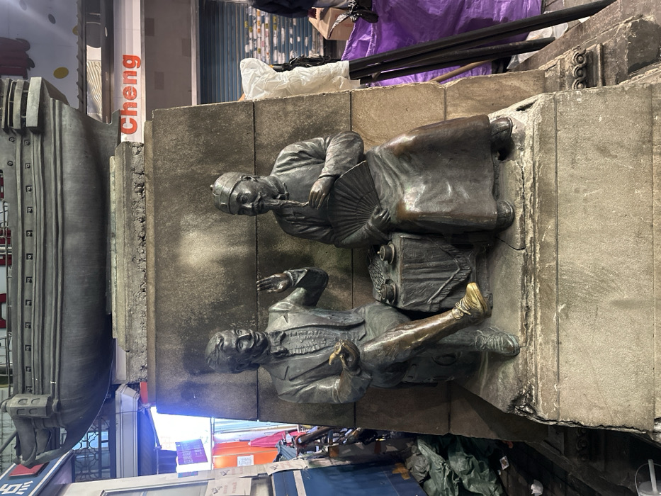The image displays a monument located in Liwan District, China. The monument consists of a multi-tiered structure primarily made of a grey, weathered material. At its apex is a bronze sculpture of a multi-masted sailing ship. Below this, on a prominent plinth, are two seated bronze statues of men, positioned as if in conversation. The figure on the left is a man depicted with a mustache, wearing a formal Western suit with a ruffled shirt and bow tie. He is seated with one leg crossed, holding a small cylindrical object in his right hand, and his left hand is raised in a gesture with the palm open. His visible shoe is a distinct golden-bronze color. The figure on the right is a man with a long, thin beard and mustache, wearing traditional East Asian attire, including a cap and a long robe. He holds a closed folding fan in his right hand, with his left hand near his beard. Between the two figures, a small, square table draped with a cloth holds two small teacups and saucers. The immediate environment around the monument is urban and appears somewhat cluttered. To the left, a blue structure is partially visible, with green tarpaulins and debris on the ground. Further back, a brightly lit area suggests an open storefront or alleyway. To the right, a white sheet or tarp covers an object, and a purple tarpaulin lies on the ground, next to several dark, vertical poles leaning against the monument. In the background, a corrugated metal security shutter is rolled down, exhibiting various marks. Above the shutter, a red sign with the word "Cheng" in white text is visible. The scene is illuminated by artificial light.