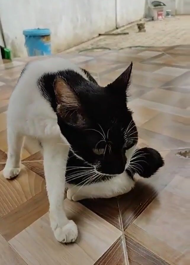 A black and white cat grooms itself on a tiled floor. The cat is mostly white on its left side and mostly black on its right side. After a moment, the cat looks up and sits still, looking off to the side. In the background, there is a white wall, a blue bucket, and some greenery. The floor has a light brown tile pattern.