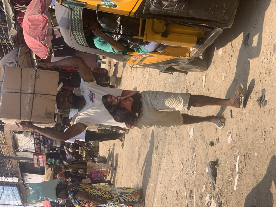 The image depicts a bustling outdoor market scene in Onitsha, Nigeria, under bright daylight