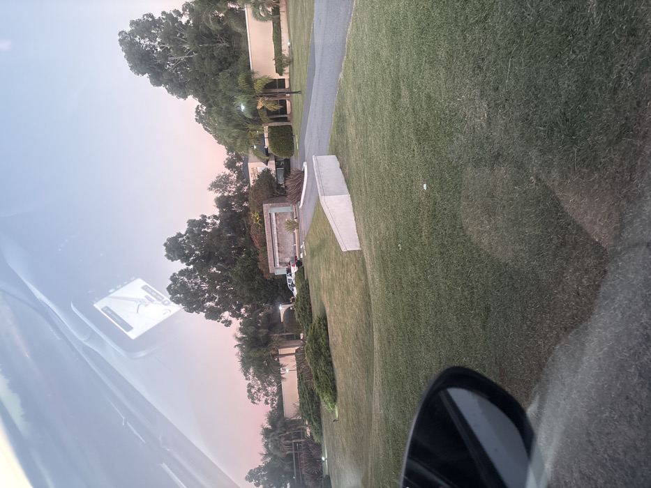 view from inside a car, looking out onto a green, grassy landscape. A road or driveway winds through the greenery, bordered by trees and manicured hedges. Buildings are visible in the background, suggesting a residential or commercial area. The sky is a soft gradient of colors, hinting at dawn or dusk. The car's dashboard and side mirror are visible in the foreground, adding perspective.
