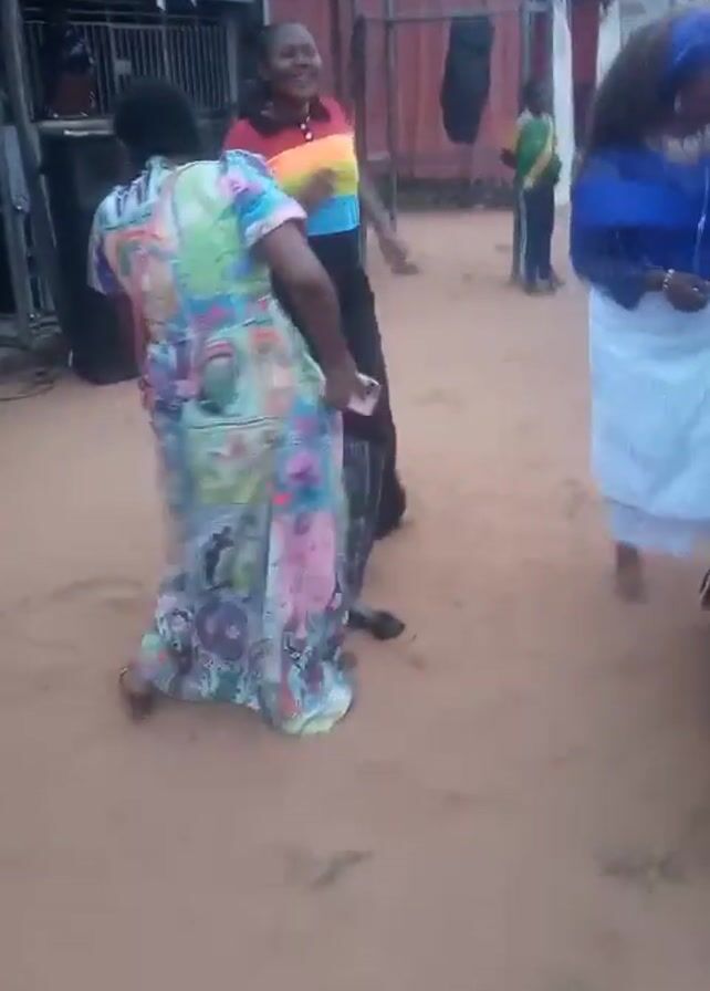small outdoor celebration in what appears to be a village or small town. Several people are dancing to music. One woman is wearing a colorful floral dress, and another wears a rainbow-striped shirt and dark pants. Several women dressed in blue tops and colorful printed skirts walk past the camera. There are small buildings visible in the background, along with tents and tables set up for the event. The ground appears to be sandy or dusty.