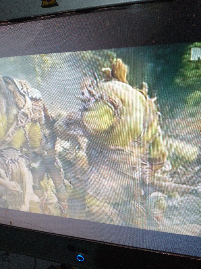 The image displays a still shot from a screen, likely a television. The scene depicts two large, monstrous figures in an outdoor setting with trees visible in the background. The figures appear to be armored or heavily clothed in earth-toned materials, primarily shades of yellow, green, and brown. Their forms are obscured, but they appear massive and imposing. The overall image quality is degraded due to being a photo of a screen.