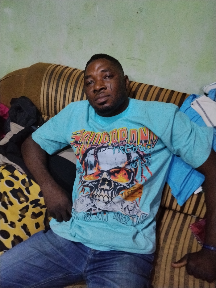 An adult male is seated indoors, likely within a residence in Gama, Nigeria