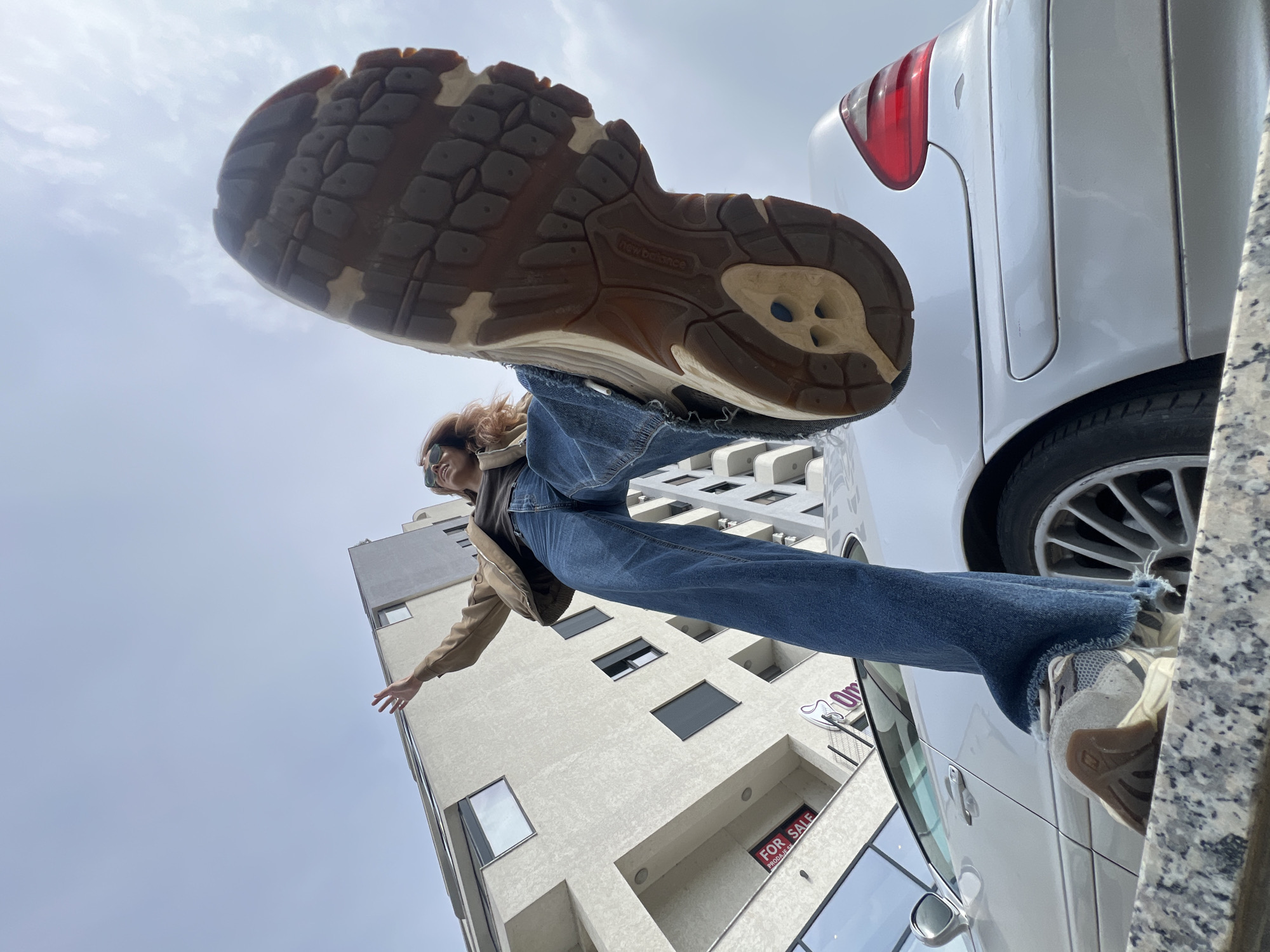 The image depicts an urban outdoor scene in Bjeliši, Montenegro, under an overcast sky. A single individual, female, is positioned centrally, viewed from a low-angle perspective. She wears blue wide-leg jeans with frayed hems, a light brown jacket, a dark top, and athletic sneakers. Her left arm is extended upwards and slightly to the left with an open hand, while her right leg is raised high towards the camera, prominently displaying the brown and beige sole of a New Balance sneaker. Her head is tilted back, and she appears to be smiling, wearing sunglasses. Behind the individual, a silver two-door automobile, consistent with a Mercedes-Benz coupe, is parked, with its rear section and right taillight visible. In the background, a light-colored, multi-story building with multiple rectangular windows stands, featuring a red "FOR SALE" sign, partially obscured, which also contains text in another language. Another taller building with darker windows is visible further back. The immediate foreground consists of a mottled grey and white granite or marble-like surface, on which the subject's left foot rests.