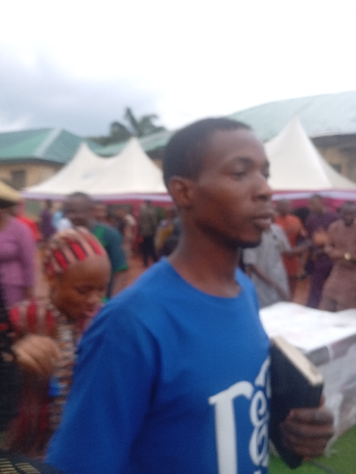 The scene depicts an outdoor gathering in Akpaka Forest Reser, Nigeria, under an overcast sky. In the right foreground, an adult male, appearing of African descent, is positioned from the chest up, facing left with his head turned slightly right. He wears a blue long-sleeved t-shirt with a partial white graphic on the chest and holds a dark-colored book under his left arm. To his left and slightly behind him, a child with red and black braided hair, wearing a striped garment, is partially visible. The midground and background contain numerous out-of-focus individuals forming a crowd. Several white, conical tents are visible in the midground. Behind these tents, buildings with dark green, pitched roofs are present, along with sparse foliage.