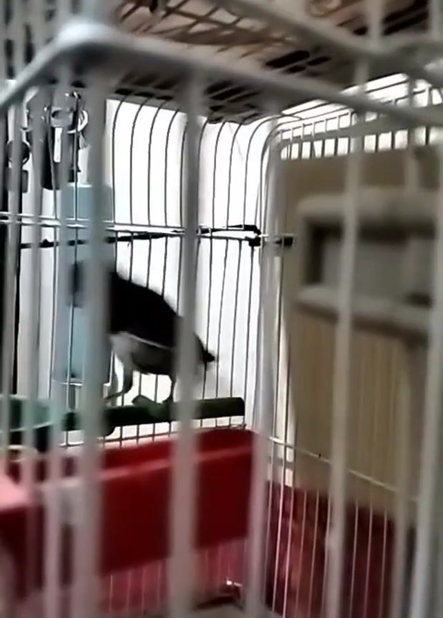 A bird with black and white plumage is perched inside a white birdcage. The cage has vertical bars and a horizontal grid on top. Inside, there's a red feeding container, a blue water dispenser, and a perch the bird is standing on. The background is blurred, appearing to be a plain wall. The bird moves slightly on the perch.