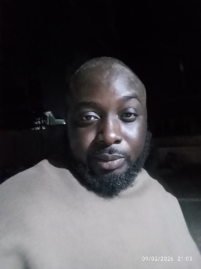 A close-up selfie of a Black man with a shaved head and a full beard. He is wearing a light brown shirt. The lighting is low, suggesting nighttime. The background is dark, making the man's face the focal point. The date "09/02/2026 21:03" is visible in the lower right corner. He is looking directly at the camera with a neutral expression.