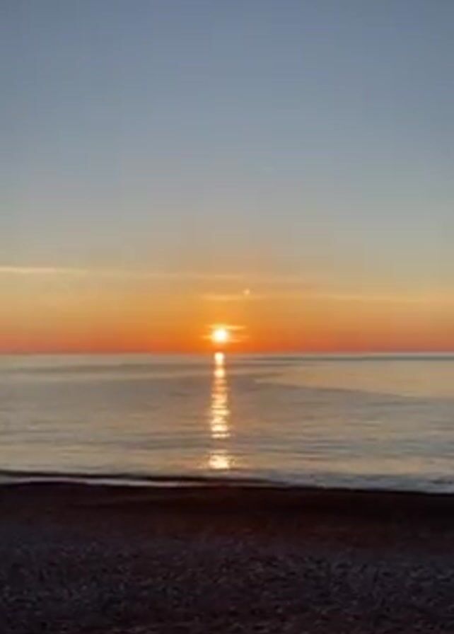static shot of a sunset over the ocean. The sun is setting directly on the horizon, casting a golden light across the water. The sky is a mix of blue and orange hues. The foreground shows a pebble beach. There are sounds of people talking.