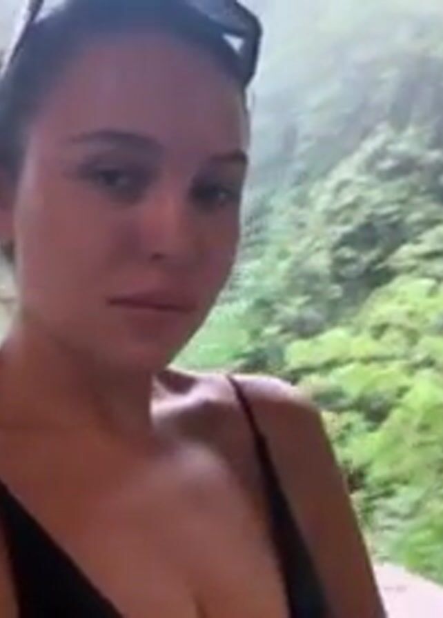 A woman with light skin, dark hair, and sunglasses on her head is filming herself in a selfie style. She is wearing a black tank top. The background is a lush green landscape with a waterfall. There are white umbrellas visible in the lower portion of the frame. The weather appears to be misty or rainy. The woman briefly sticks her tongue out at the camera.