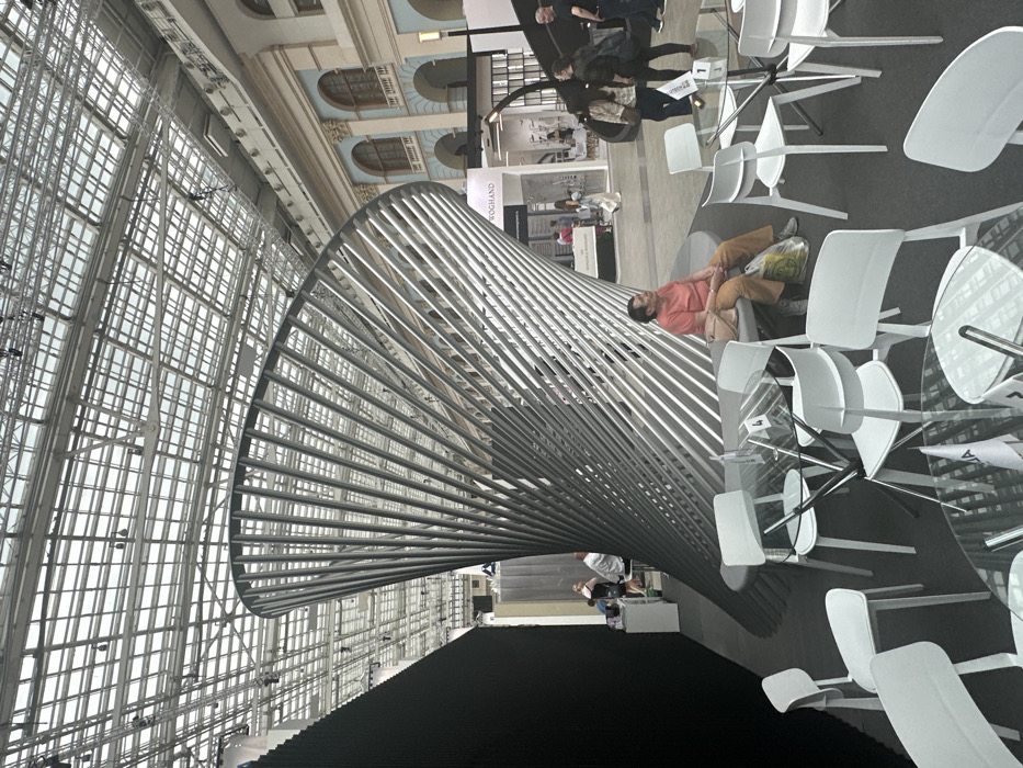 n interior space within a large building, possibly a modern art gallery or exhibition hall. The location is near the Manezhnaya Square in Moskva, Russia, based on the provided coordinates. The space features a large, metal sculpture in the center, composed of a series of curved, vertical strips arranged in a radiating pattern. White chairs are positioned around two glass-top tables on a grey floor. A woman in a pink shirt sits on a white bench in the background. The building has a large, open glass ceiling. The walls are off-white and feature an arched entranceway, visible in the background. Several people can be seen walking around, in the distance. The image conveys a contemporary and airy atmosphere.