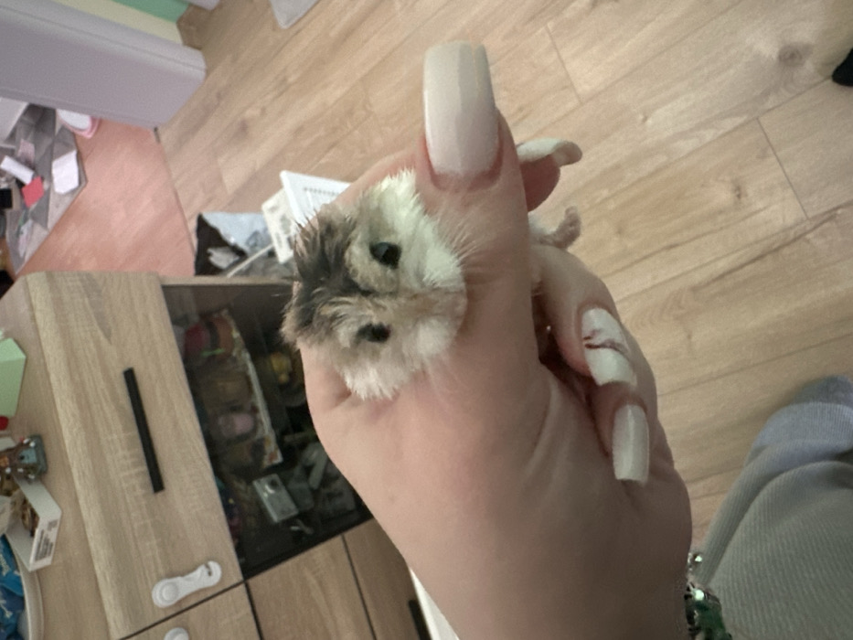 An interior scene in Beloslav, Bulgaria, depicts a human left hand holding a small hamster
