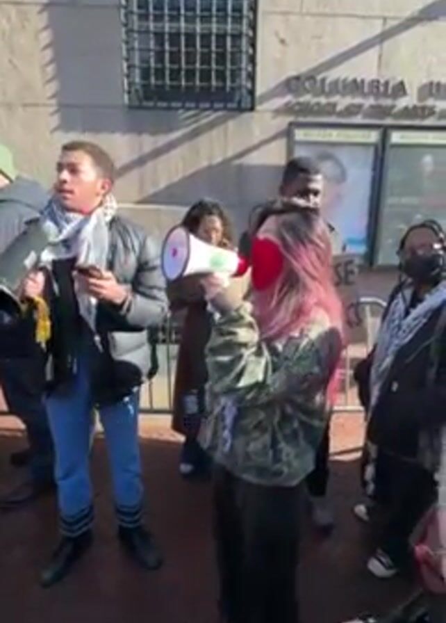 The video depicts a group of people protesting in front of a building that reads, "Columbia University, School of the Arts, Miller Theatre." One individual, a woman with pink hair, is using a megaphone to address the group. She is wearing a camouflage jacket and black pants. Others in the group hold signs. One individual, a man, is holding a smartphone in one hand, and what appears to be a small speaker in the other. He is wearing a black puffer jacket, jeans, and a scarf. The ground is brick. The weather appears to be sunny. The group is standing close together, appearing to be engaged in a protest or demonstration.
